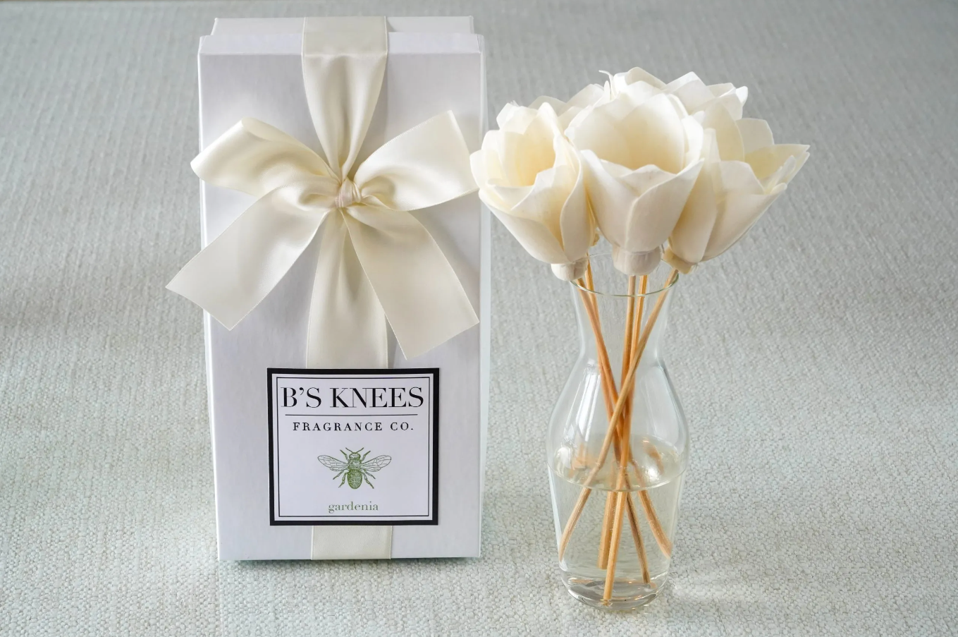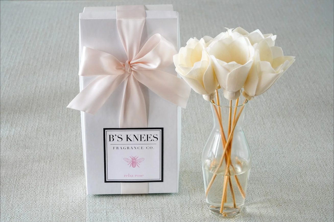 Each gift set includes one clear glass vase, one resealable essential oil- based fagrance bottle, 4 flower reeds, and four plain reeds all packaged in a beautiful white gift box tied with a double-satin bow, making it the perfect gift.
